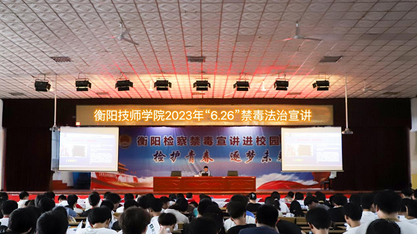 為貫徹落實黨的二十大精神和習近平總書記關于加強禁毒工作的系列重要指示批示精神,扎實開展學習貫徹習近平新時代中國特色社會主義思想主題教育,6月20日上午,學院在大禮堂開展“6·26”禁毒法治宣講。衡陽市人民檢察院第二檢察部主任張鈞出席活動,衡陽檢察法治宣講專干鄭國寶應邀作禁毒知識法治宣講。