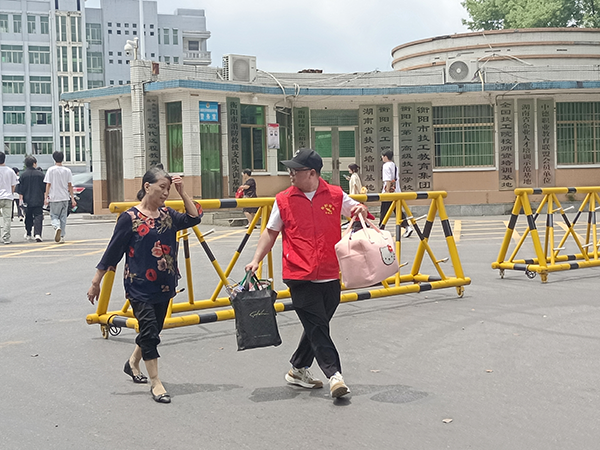 高溫下,黨員志愿者在校園內、南門、北門處維持學生離校秩序,幫助學生提拿行李,送其乘車,引導家長車輛有序行駛和停放。他們用愛心守護學生平安,用熱情傳遞溫暖關懷。