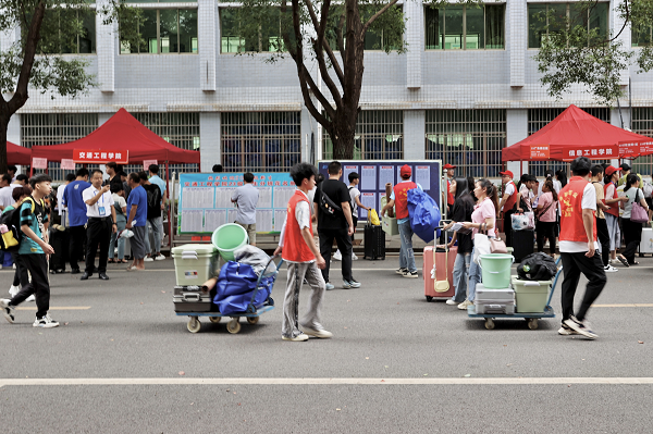 報到現場,志愿者們耐心地為新生提供引導、答疑、行李搬運等服務,新生們感受著來自迎新志愿者的熱情,笑容洋溢在每一位新同學的臉上。