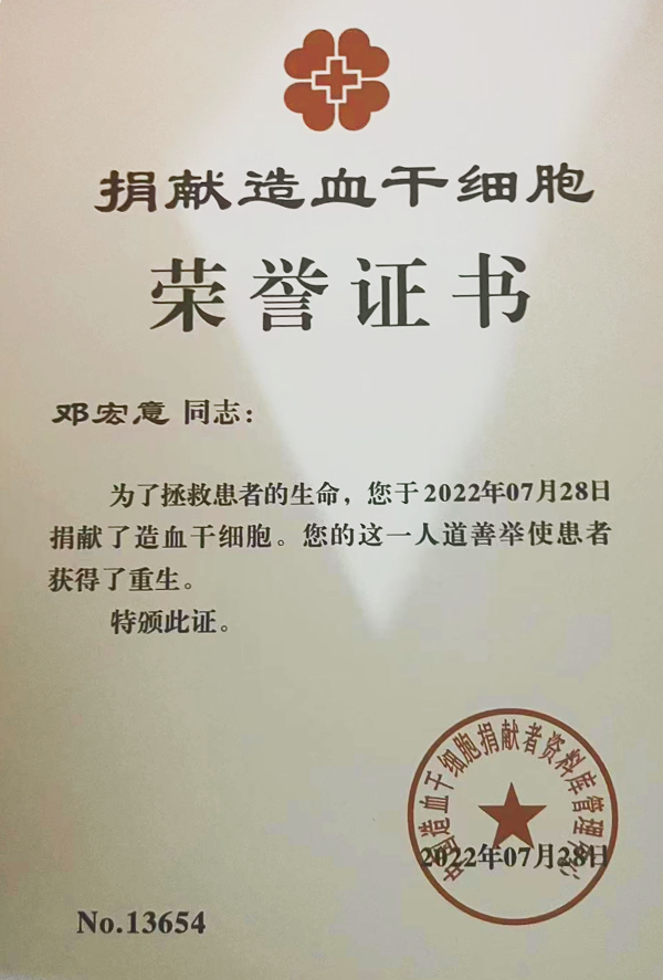 鄧宏意于2021年5月加入中國造血干細胞捐獻者資料庫管理中心,2022年5月與杭州的一名患者匹配成功。捐獻造血干細胞對于一般人來說并不是一件小事,但當管理中心工作人員找到他時,他卻同意捐獻。2022年6月,鄧宏意體檢順利通過,2022年7月,他成功捐獻了造血干細胞,為患者點燃了生命的希望。