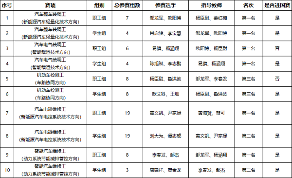 此次競賽全省參賽人數172人次,每個賽項分教師組和學生組,每組2人。我院教師組和學生組均參加了汽車整車裝調工、汽車電氣裝調工、機動車檢測工、汽車電器維修工、智能汽車維修工等5個賽項,其中教師組榮獲第一名三組,學生組榮獲第一名兩組,同時教師組和學生組共八組進入國賽。