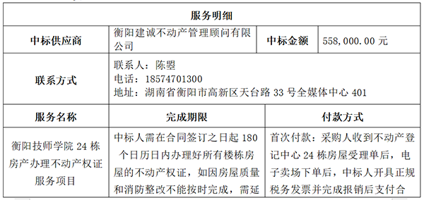 衡陽(yáng)技師學(xué)院24棟房產(chǎn)辦理不動(dòng)產(chǎn)權(quán)證服務(wù)項(xiàng)目于2025年01月03日結(jié)束,現(xiàn)將中標(biāo)結(jié)果公告如下: