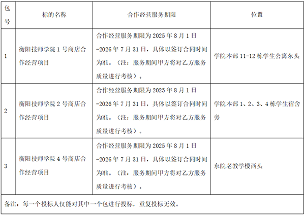 衡陽技師學院的衡陽技師學院1、2、4號商店合作經營項目院內招標于2025年6月18日結束,現將中標結果公告如下:
