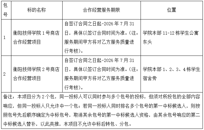華新項目管理集團有限公司受衡陽技師學院的委托,對衡陽技師學院1、2號商店合作經營項目進行院內自主招標,邀請符合資質條件的投標人來參加投標。