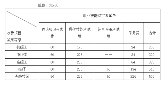 我院職業技能等級認定收費標準如下: