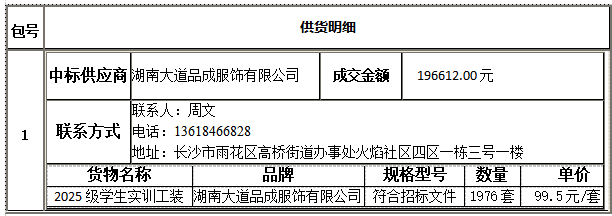 衡陽技師學院遴選2025級學生實訓工裝供應商公開招標采購于2026年03月05日結束,現將中標(成交)結果公告如下: