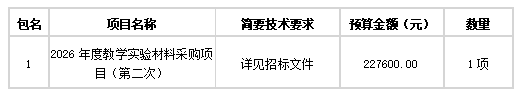 湖南省招標有限責任公司采購代理機構受衡陽技師學院的委托,對2026年度教學實驗材料采購項目(第二次)(委托代理編號:0623-2685N1124006 )進行公開招標采購。歡迎符合資格條件的投標人前來投標。