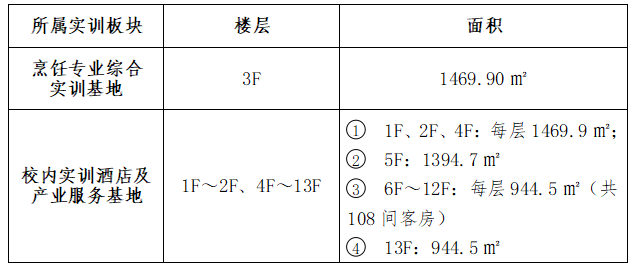 本次共建的酒店及烹飪專業(yè)綜合實訓(xùn)基地,總建筑面積合計14830.3㎡(設(shè)計圖標(biāo)示面積),具體布局(見附件1:綜合培訓(xùn)中心建筑平面設(shè)計圖)、面積及所屬實訓(xùn)板塊如下: