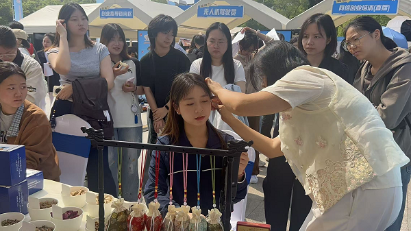 活動現場,學院師生現場展示了把脈問診、耳部貼穴、發型設計、專業手部護理等動態實操,并提供免費體驗服務。職業培訓學院院長田維凌介紹,以正值風口的中醫養生為例,如果在校醫學生能將所學專業與相關工種有機銜接,無疑能為高質量就業增添更多砝碼。