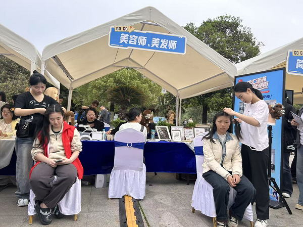 4月18日,“智匯瀟湘 才聚湖南”2026年湖南省促進高校畢業生就業創業專場招聘活動(湘南片區)暨“湘才留湘”生物醫藥衛生專場招聘活動在衡陽舉行。衡陽技師學院經貿旅游學院師生在招聘活動養生保健體驗區展現技能風采。