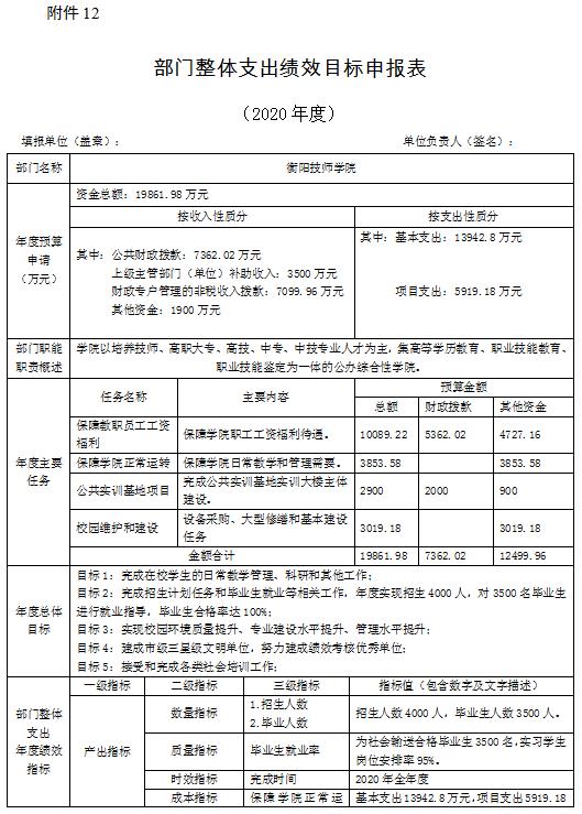 衡陽技師學院2020年部門預算和“三公”經費預算說明