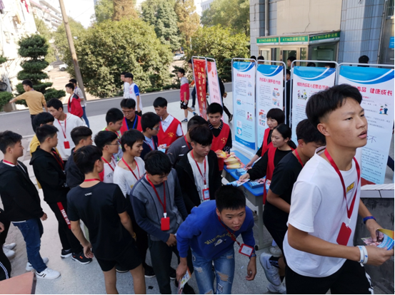 志愿者對青年學生發放青少年法治宣傳教育折頁和讀本