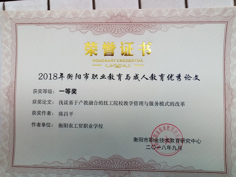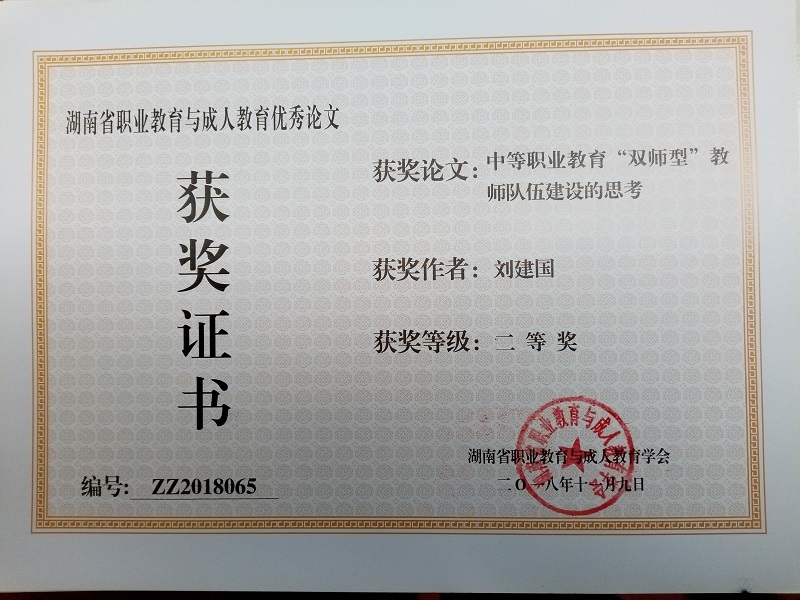 在湖南省2018年度技工教育和職業(yè)培訓(xùn)優(yōu)秀論文評審中獲一等獎3篇、二等獎3篇、三等獎2篇;在湖南省/衡陽市職業(yè)教育與成人教育論文評審中,獲省級二等獎2篇,三等獎3篇;市級一等獎7篇、二等獎4篇、三等獎10篇;在市經(jīng)濟學(xué)會2018年度優(yōu)秀論文評審中獲特等獎1篇、一等獎1篇、二等獎3篇。