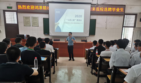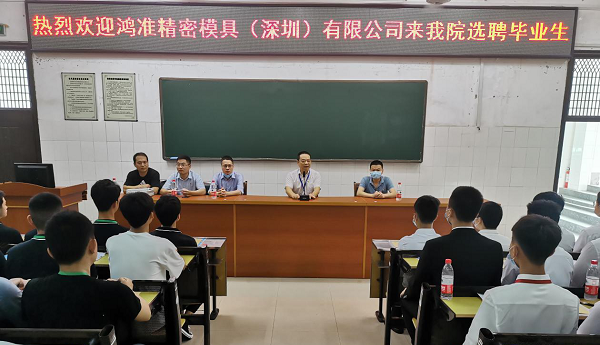 6月10日上午,世界五百?gòu)?qiáng)企業(yè)——深圳市富士康集團(tuán)旗下鴻準(zhǔn)精密模具(深圳)有限公司來(lái)我院對(duì)17級(jí)鴻準(zhǔn)定向班100多名學(xué)生舉辦專場(chǎng)招聘會(huì)。學(xué)院黨委委員、副院長(zhǎng)廖與飛、鴻準(zhǔn)精密模具人力資源專理朱煒出席招聘會(huì)。