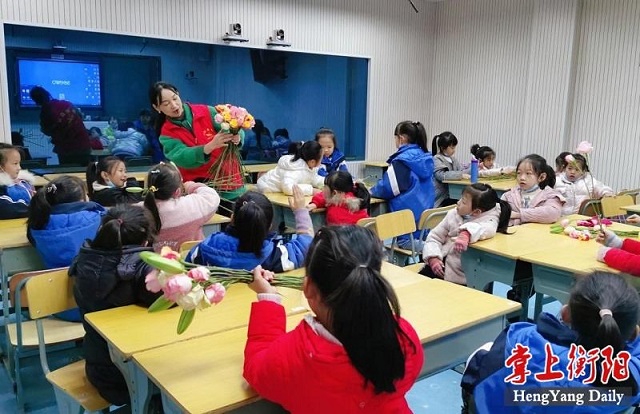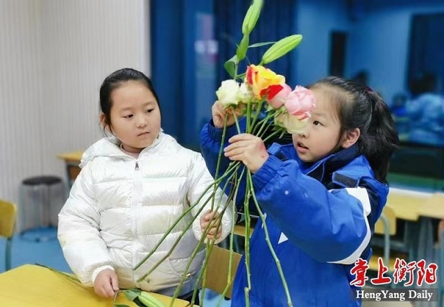 “像這樣,把幾支花螺旋擺放……”剪紙插花班里,支教老師謝姣玉邊耐心講解插花的基本方法,邊示范西式插花手法。孩子們第一次接觸插花藝術(shù),倍感好奇和新鮮。大家有模有樣地擺弄著,張張笑臉如花兒一樣燦爛明媚。