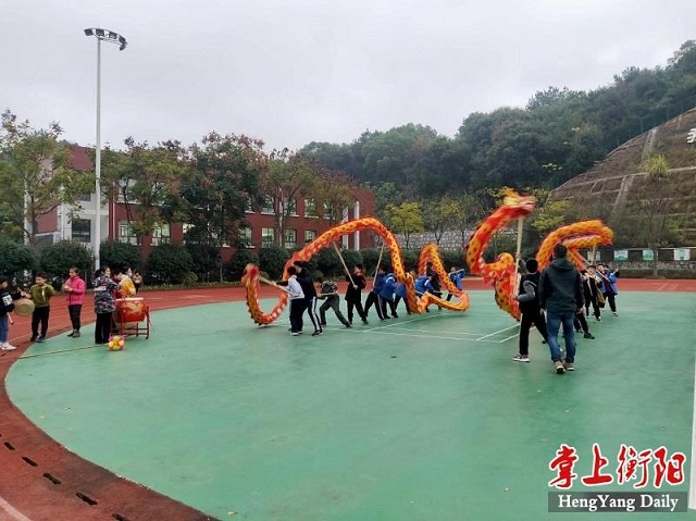 衡陽技師學院舞龍表演支教老師陳祖昆先給孩子們細致地講述了舞龍傳統(tǒng)文化、舞龍的基本技巧、動作要領(lǐng)和細節(jié)要求,然后示范龍珠和鑼鼓樂器的配合。孩子們興致盎然,躍躍欲試,在認真聆聽和觀看示范后,迫不及待地開始了練習。經(jīng)過近兩個小時的訓練,兩支舞龍隊動作配合協(xié)調(diào),胳膊掄動有力,孩子們在大汗淋漓中領(lǐng)略到舞龍傳統(tǒng)藝術(shù)的魅力。