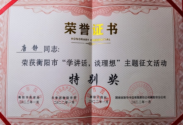 本網(wǎng)訊 3月11日,衡陽市黨史學習教育理論征文暨“學講話,談理想”主題征文評選活動結(jié)果揭曉,我院師生作品喜獲特別獎1項,二等獎1項,三等獎1項,充分展現(xiàn)了學院黨史學習教育的優(yōu)秀成果。