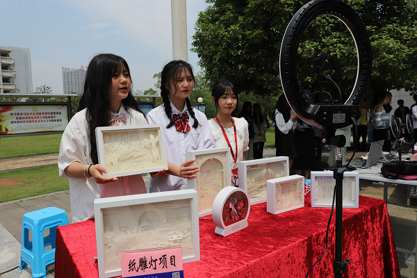“歡迎各位小伙伴們來(lái)到我們時(shí)光漫影小店的直播間,今天帶來(lái)了我們同學(xué)自己手工制作的光影藝術(shù)燈‘紙雕燈’......”學(xué)院信息與生物技術(shù)系學(xué)生許欣怡、鄭淑芳、曾琪化身“主播”,現(xiàn)場(chǎng)直播介紹紙雕燈項(xiàng)目,吸引不少初中生在技能特色展示區(qū)駐足圍觀,贏得現(xiàn)場(chǎng)陣陣贊嘆。