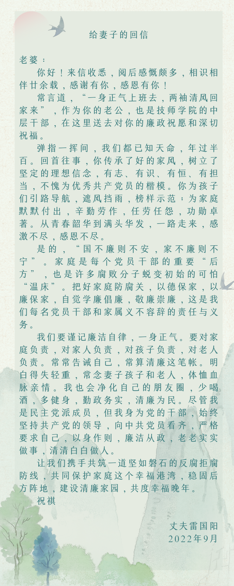 清廉學校——書記、院長評家書(八)|副院長周少良同志評家書:平淡是真 知足常樂