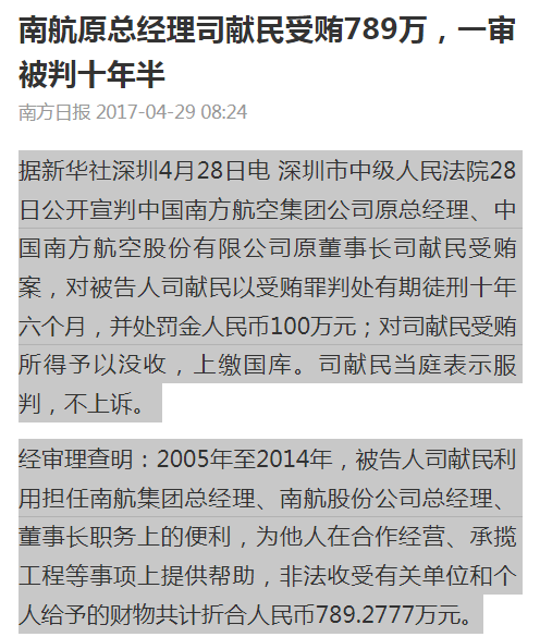【解說詞】2014年11月至12月,中央第一巡視組對南航集團進行專項巡視。南航集團原黨組副書記、總經理司獻民,因巡視發現的問題線索被立案審查。2017年4月,司獻民因受賄罪被判處有期徒刑十年零六個月。