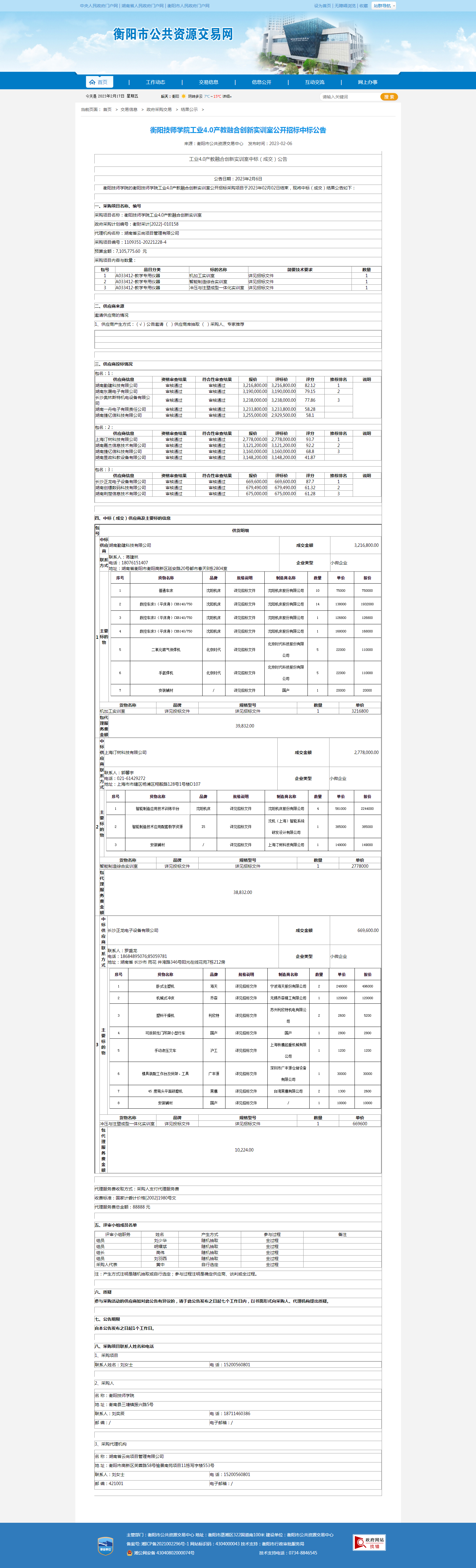衡陽技師學院工業4.0產教融合創新實訓室公開招標中標公告