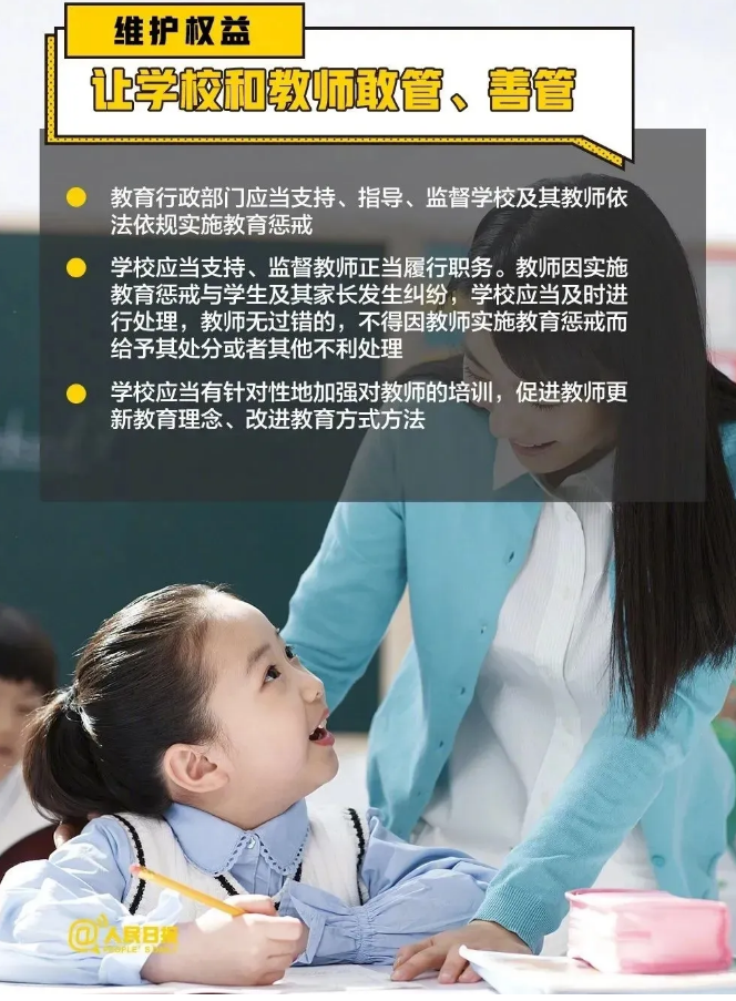 教育是一門藝術,教育懲戒是這門藝術中尤為特殊的部分,既要遵循教育規律原則,又要靈活運用,重視方式方法和實際。《規則》為此作了多層次的規定。首先,要求學校、教師提高能力,會用善用。《規則》專門規定,學校應當有針對性地加強對教師的培訓,促進教師更新教育理念、改進教育方式方法,提高教師正確履行職責的意識與能力。教師應當審慎使用教育懲戒,與鼓勵、勸導、積極管教等教育方式相結合,確有必要再合理使用。其次,強化保障,保證能用敢用。由于輿論壓力、安全風險壓力等,實踐中教師往往顧慮重重,不敢實施教育懲戒。《規則》明確,學校應當支持、監督教師正當履行職務,教育懲戒是教師的職務行為,教師正常履職產生的糾紛和法律后果應由學校承擔。教師因實施教育懲戒與學生及其家長發生糾紛,學校應當及時進行處理,教師無過錯的,不得因教師實施教育懲戒而給予其處分或者其他不利處理。即使因為教師實施教育懲戒與家長產生糾紛,也要通過合理合法的正當渠道解決,家長威脅、侮辱、傷害教師的,學校、教育部門、公安機關要依法予以追究,維護教師合法權益。最后,健全監督,避免濫用。《規則》明確了教育懲戒后的救濟渠道,包括校內申訴、向主管部門申訴,符合法定受理條件的還可以進行行政復議和行政訴訟;明確教師不當實施管理行為要承擔相應責任。《規則》健全了監督機制,暢通了救濟渠道。