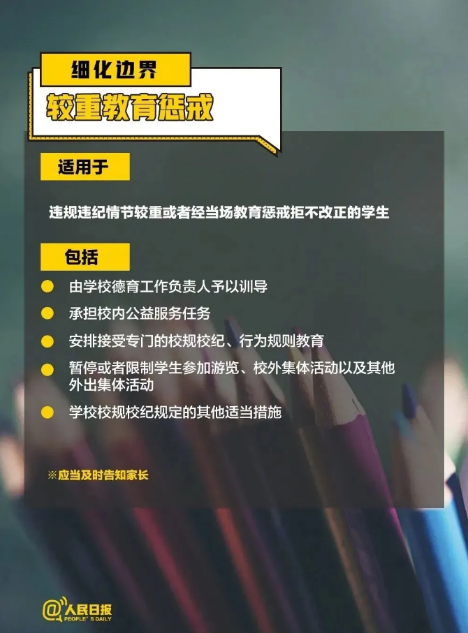 第十條 小學高年級、初中和高中階段的學生違規違紀情節嚴重或者影響惡劣的,學校可以實施以下教育懲戒,并應當事先告知家長:
