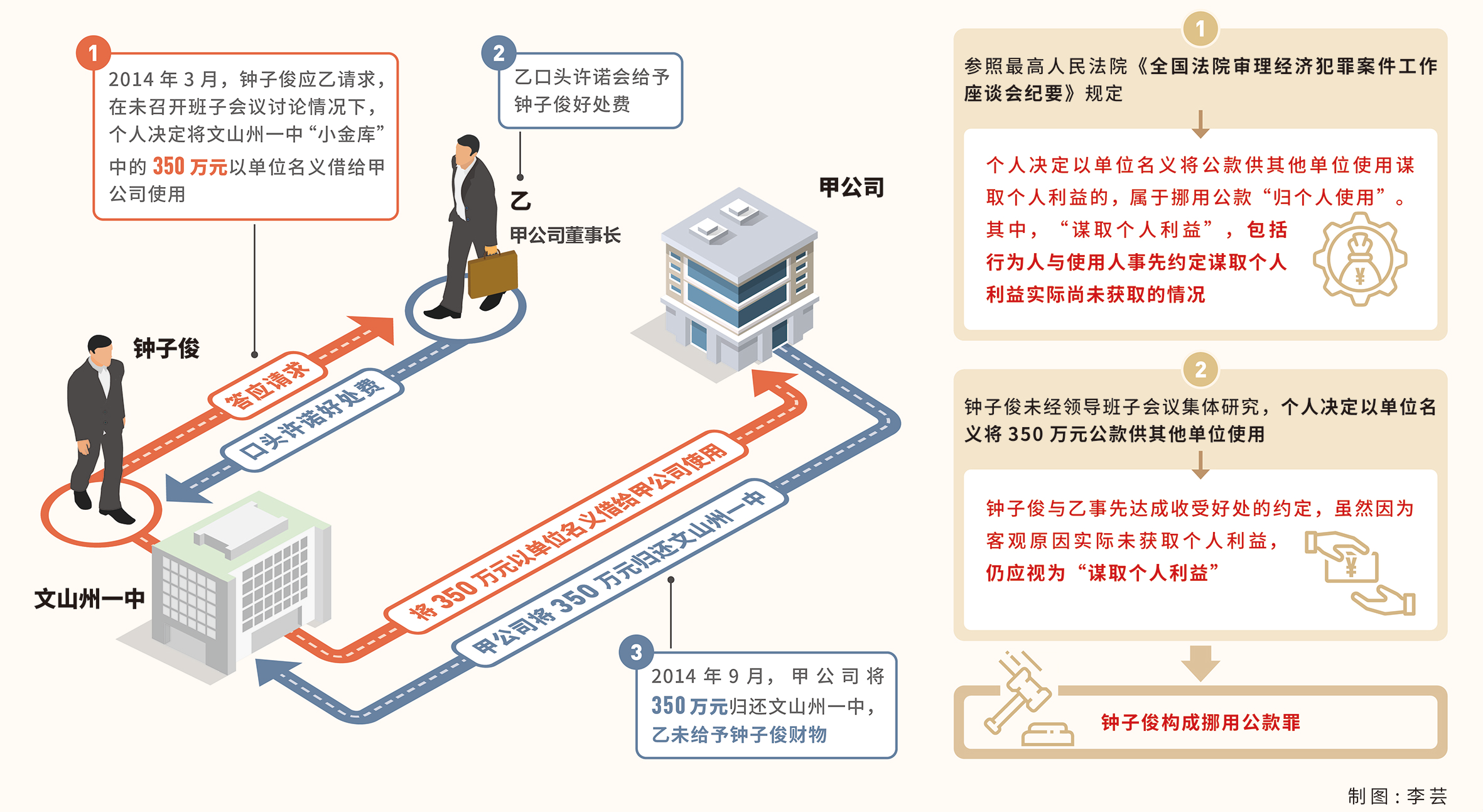 羅凱:“小金庫”是指違反法律法規及其他有關規定,應列入而未列入符合規定的單位賬簿的各項資金(含有價證券)及其形成的資產。文山州一中違規收取學生擇校費設立“小金庫”,由財務人員管理使用,用于償還單位債務或公務開支。該“小金庫”中的資金本應依法上繳國家財政予以支配,屬于公款。故鐘子俊個人決定將“小金庫”中350萬元借給甲公司使用,屬于挪用公款。