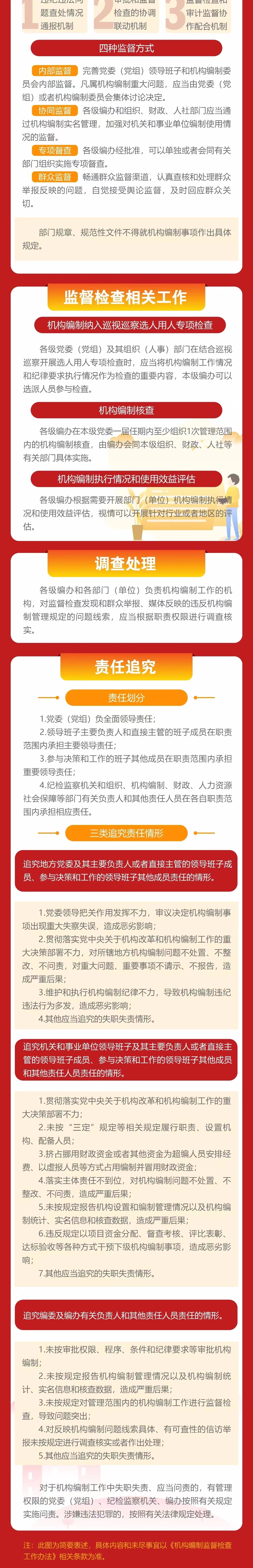 第十一條 建立健全機構編制監(jiān)督檢查工作機制。堅持預防與懲治相結合,日常監(jiān)督與專項督查相結合,上級黨組織監(jiān)督與內(nèi)部監(jiān)督、審計監(jiān)督、群眾監(jiān)督相結合,將監(jiān)督檢查貫穿于機構編制管理全過程。
