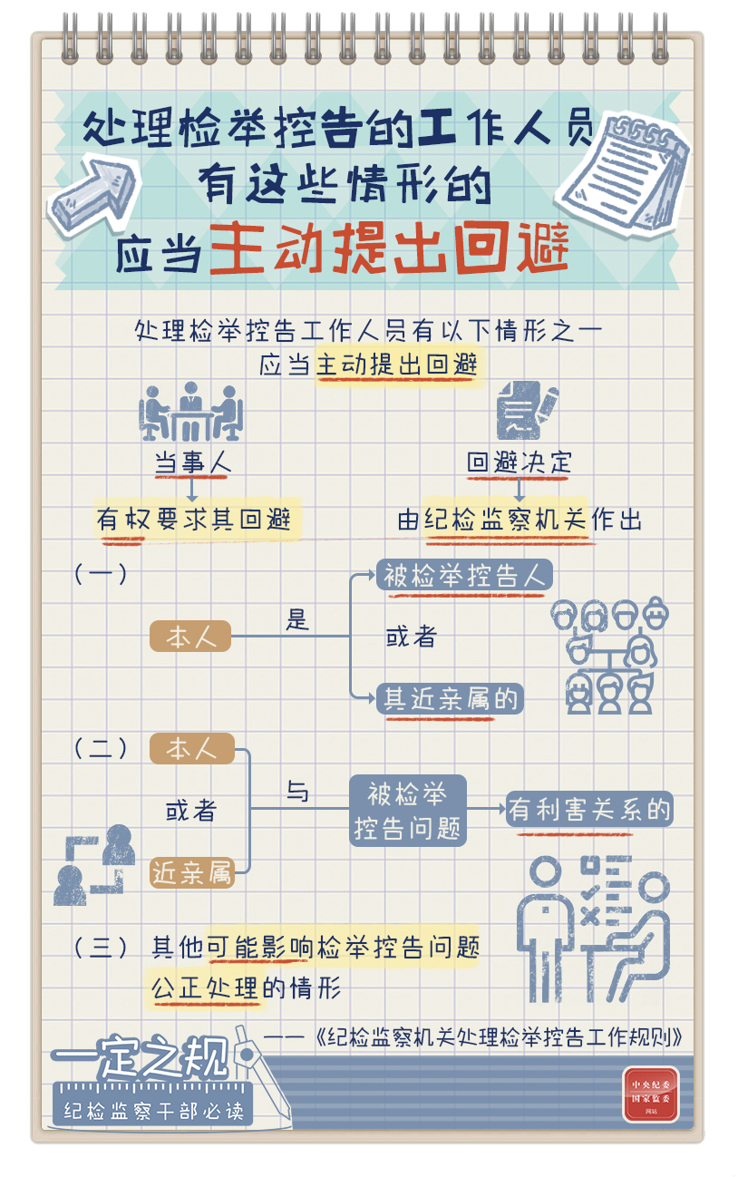 第四十八條 處理檢舉控告工作人員有以下情形之一,應當主動提出回避,當事人有權要求其回避,回避決定由紀檢監察機關作出: