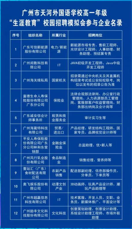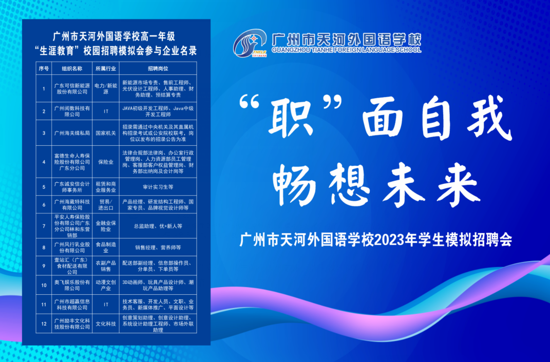 信息時(shí)代高速發(fā)展,知識(shí)迭代更新,社會(huì)分工精細(xì),職業(yè)是三者交匯的中心,既是生存之道,也是個(gè)人價(jià)值實(shí)現(xiàn)的平臺(tái)和需求。中學(xué)生正處于一個(gè)即將定型又尚未定型的可塑性很強(qiáng)的階段,夢(mèng)想還是雛形,“理想很飽滿,現(xiàn)實(shí)很骨感!”和課堂知識(shí)相對(duì)社會(huì)發(fā)展有所滯后都是當(dāng)下教育必須直面的挑戰(zhàn),因此職業(yè)體驗(yàn)是中學(xué)教育對(duì)社會(huì)和時(shí)代發(fā)展的回應(yīng),而且中學(xué)生萌芽的理想也需要職業(yè)體驗(yàn)來(lái)對(duì)沖,通過(guò)調(diào)整自我,更穩(wěn)健地應(yīng)對(duì)未來(lái)挑戰(zhàn)。5月26日下午,學(xué)校舉辦“‘職’面自我,暢想未來(lái)”——廣州市天河外國(guó)語(yǔ)學(xué)校“生涯教育”校園模擬招聘會(huì),助力學(xué)子們?cè)谇啻嘿惖郎吓艿酶鼒?jiān)定、更精彩和更遠(yuǎn)闊。