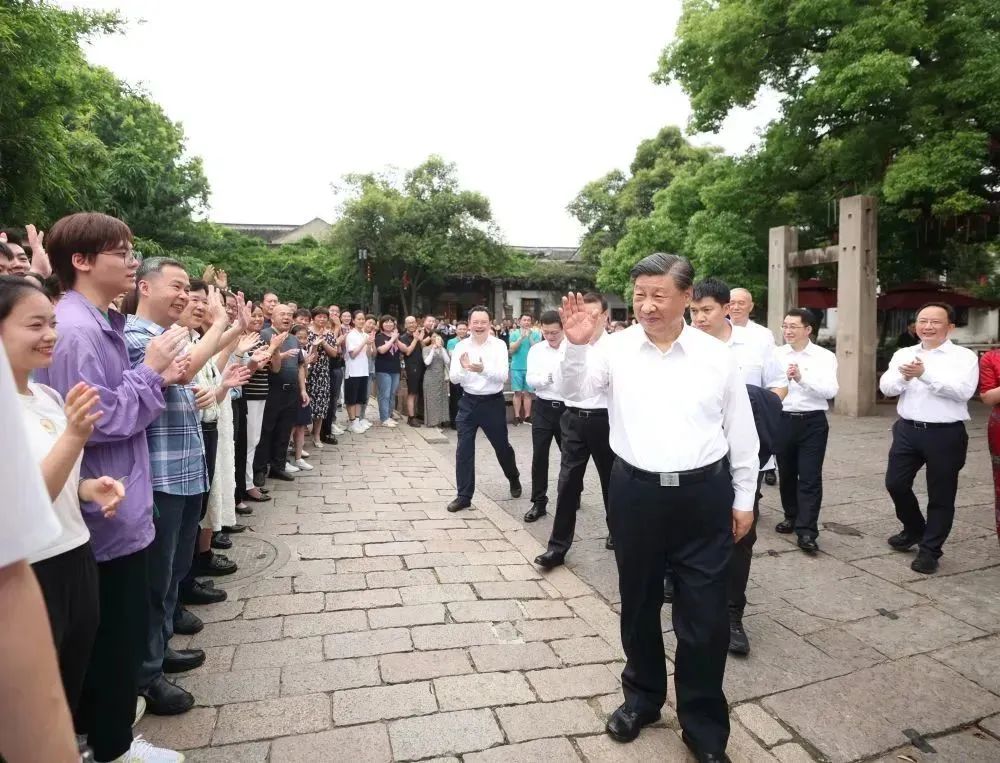 7月5日至7日,中共中央總書記、國家主席、中央軍委主席習近平在江蘇考察。這是6日上午,習近平在蘇州平江歷史文化街區,向當地居民和游客揮手致意。新華社記者 鞠鵬 攝