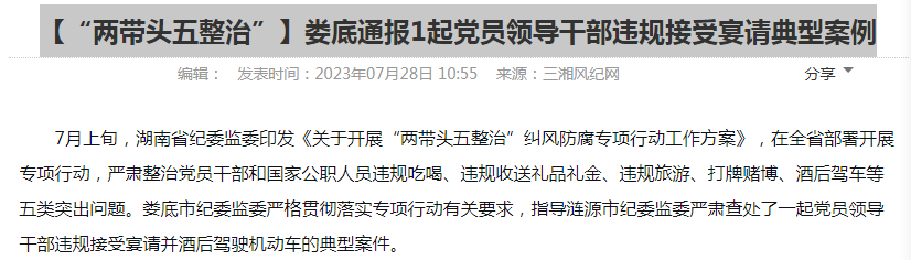 7月上旬,湖南省紀委監委印發《關于開展“兩帶頭五整治”糾風防腐專項行動工作方案》,在全省部署開展專項行動,嚴肅整治黨員干部和國家公職人員違規吃喝、違規收送禮品禮金、違規旅游、打牌賭博、酒后駕車等五類突出問題。婁底市紀委監委嚴格貫徹落實專項行動有關要求,指導漣源市紀委監委嚴肅查處了一起黨員領導干部違規接受宴請并酒后駕駛機動車的典型案件。