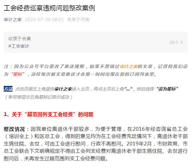 整改情況:因我單位離退休干部較多,為便于管理,在2016年經(jīng)咨詢省總工會(huì)(培訓(xùn)會(huì)上)和區(qū)總工會(huì),得到的意見均為在工會(huì)經(jīng)費(fèi)充足情況下,離退休老干部生病住院、去世,可由工會(huì)進(jìn)行慰問,行政不再慰問。2019年2月,市財(cái)政局、市總工會(huì)聯(lián)合下文明確規(guī)定不得由工會(huì)列支經(jīng)費(fèi)對離退休老干部生病住院、去世進(jìn)行慰問后,未再發(fā)生過超范圍列支工會(huì)經(jīng)費(fèi)問題。