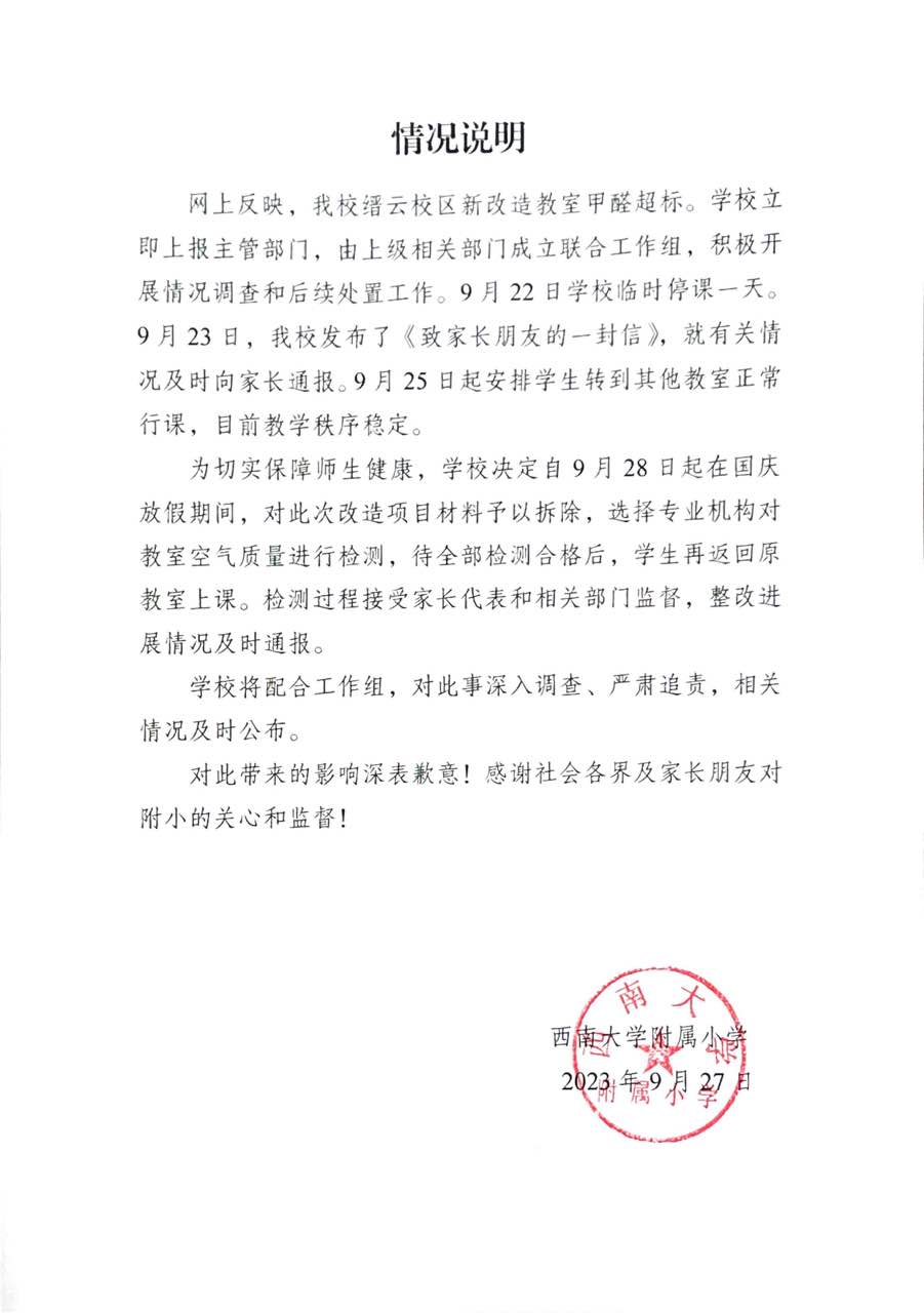 西南大學附屬小學縉云校區新改造教室甲醛超標,停課,拆除材料,嚴肅追責
