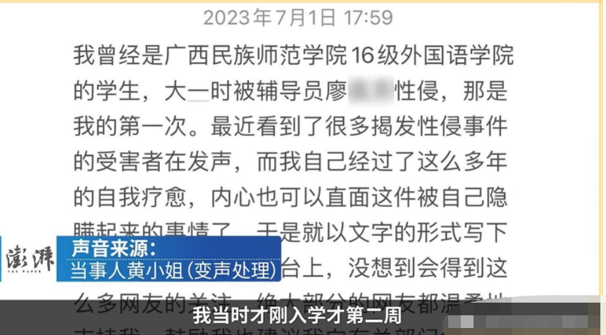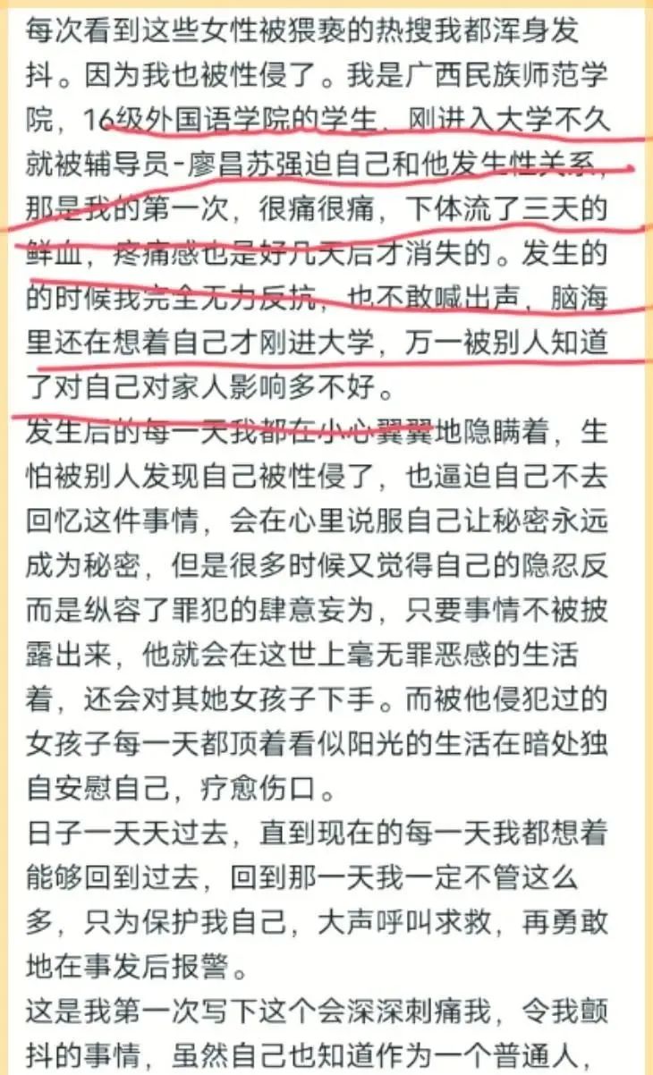 近日,廣西民族師范學(xué)院16級(jí)畢業(yè)女大學(xué)生(就讀于外國(guó)語(yǔ)學(xué)院)在網(wǎng)絡(luò)平臺(tái)上公開指控,在她大一的時(shí)候遭受了外國(guó)語(yǔ)學(xué)院輔導(dǎo)員的性侵 。