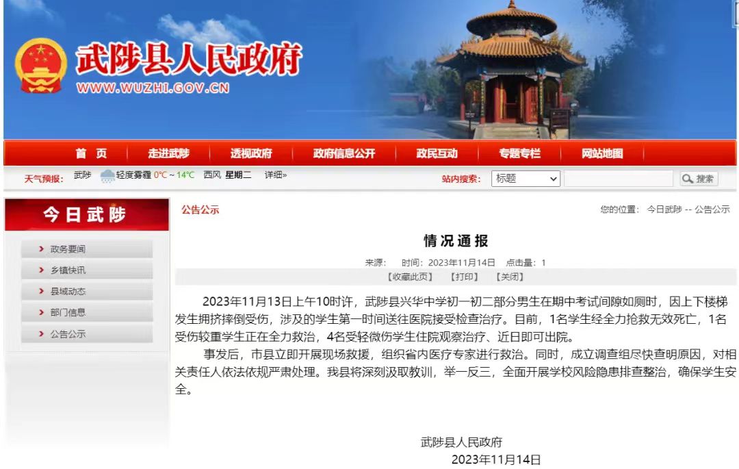 武陟縣人民政府關于興華中學學生因樓梯擁擠發(fā)生踩塌事故的情況通報