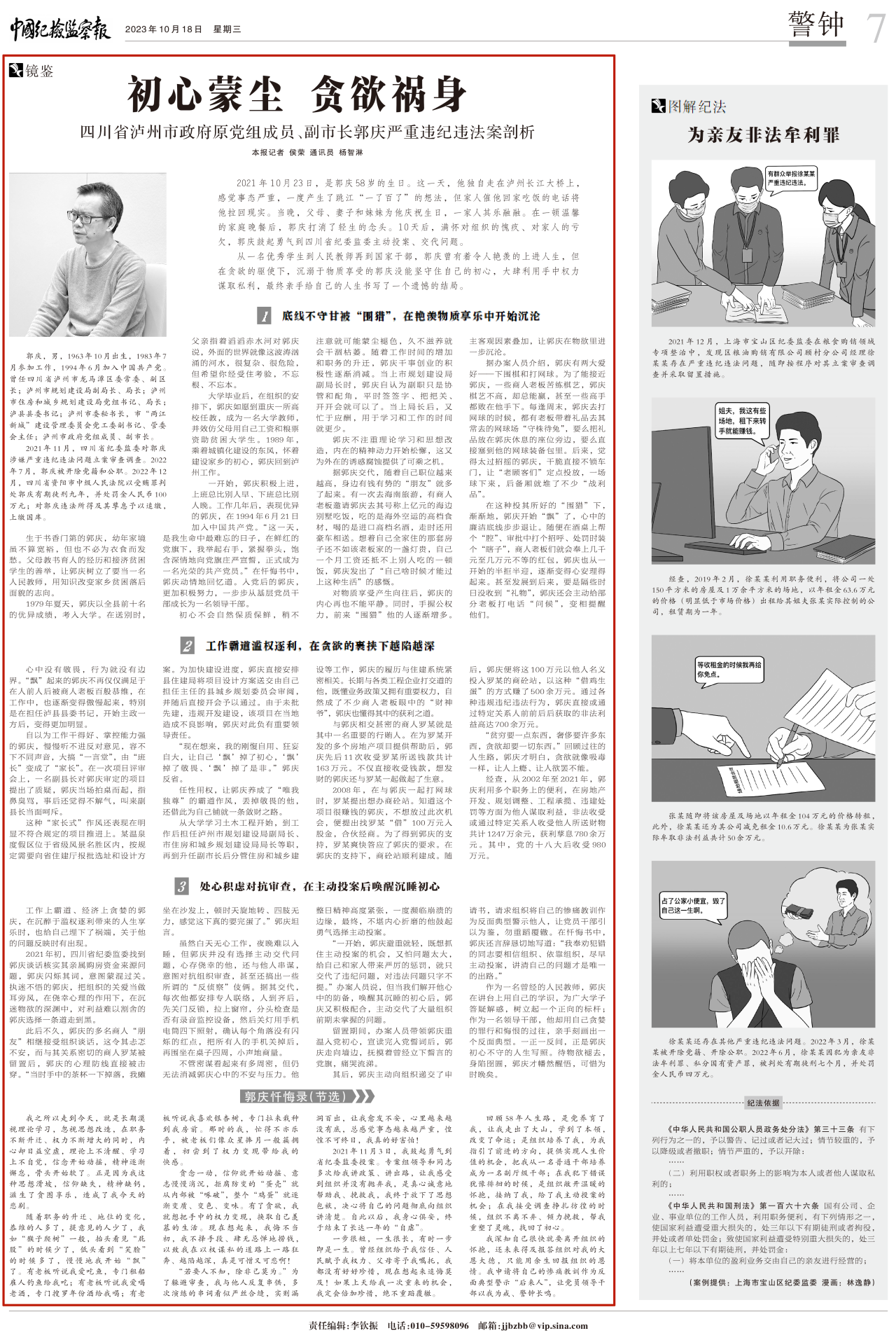 “貪欲就像吸毒一樣,讓人上癮,讓人欲罷不能……落得今天這個下場,也是咎由自取。”在近期四川省紀委監委網站發布的懺悔實錄中,瀘州市政府原黨組成員、副市長郭慶現身說法,給觀看者敲響警鐘。