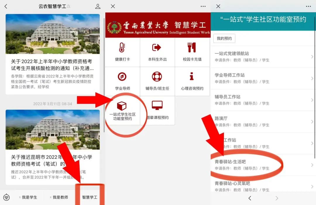 提前1—3天在微信公眾號“云農智慧學工”提交預約申請,具體操作為:云農智慧學工→智慧學工→一站式學生社區功能室預約→青春驛站·生活吧。