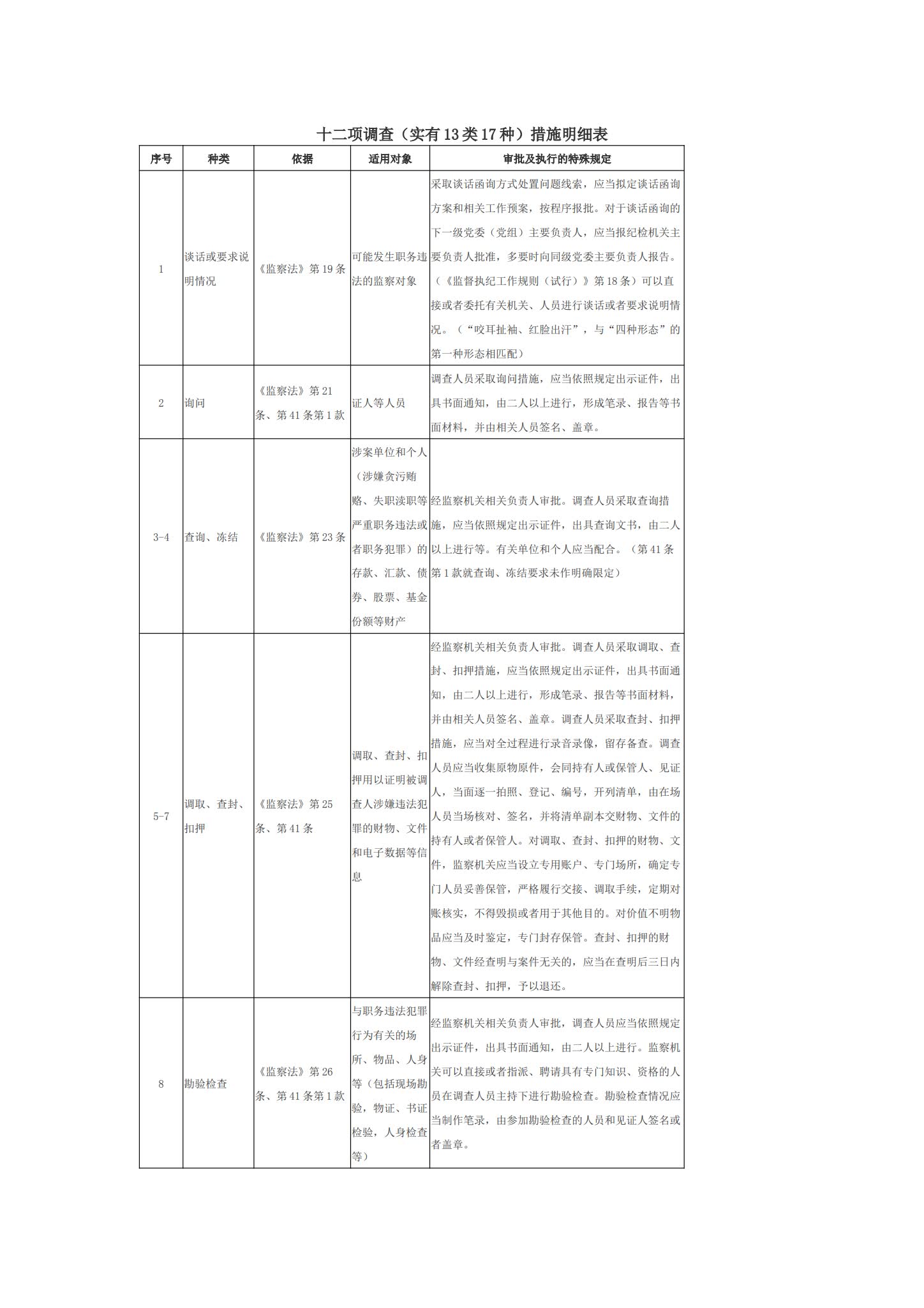 監察機關十二項調查措施明細表