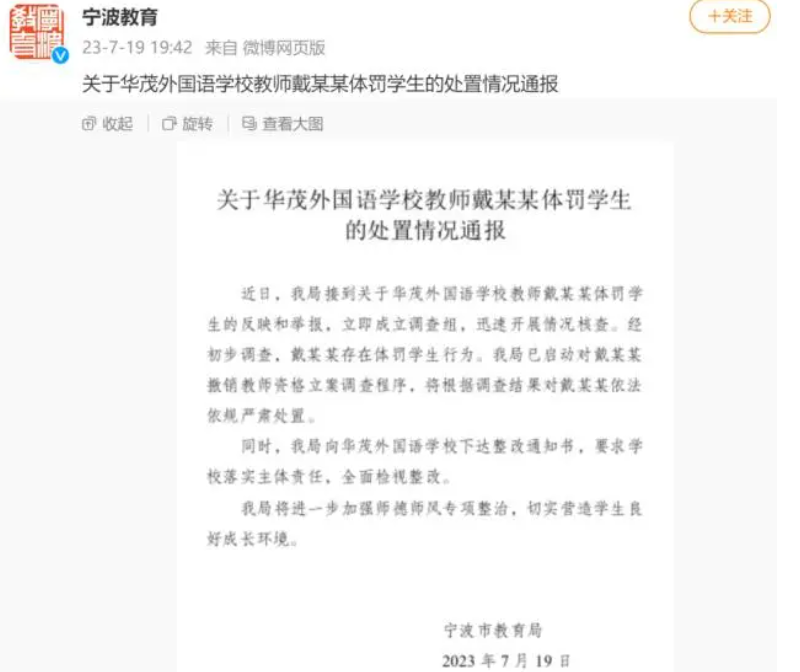 因體罰學生,寧波市教育局啟動對華茂外國語學校教師戴某某撤銷教師資格立案調查程序