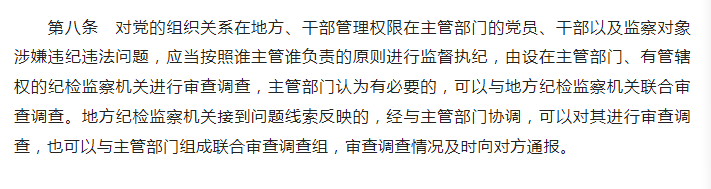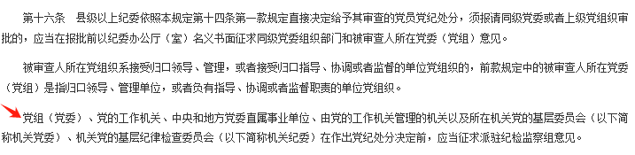 第6條第1款“給予駐在部門的處級及以下黨員干部黨紀(jì)處分,由部門機(jī)關(guān)黨委、機(jī)關(guān)紀(jì)委進(jìn)行審查和審理,并依據(jù)《中國共產(chǎn)黨章程》第四十二條規(guī)定履行相應(yīng)程序后,由黨組討論決定。在作出黨紀(jì)處分決定前,應(yīng)當(dāng)征求派駐紀(jì)檢監(jiān)察組意見‘;