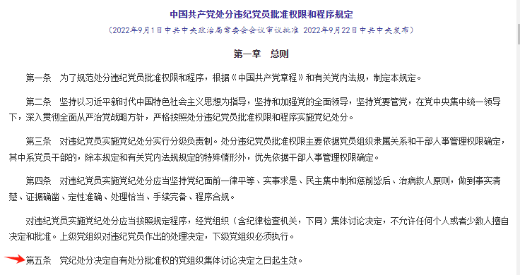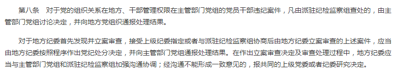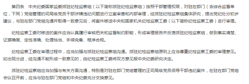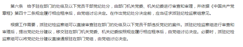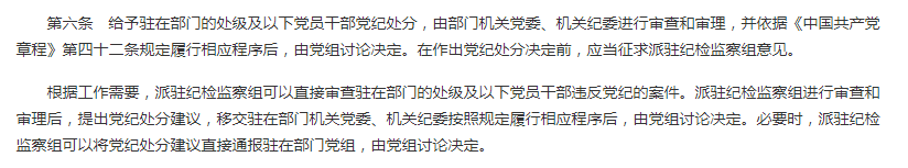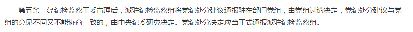 第5條"經(jīng)紀(jì)檢監(jiān)察工委審理后,派駐紀(jì)檢監(jiān)察組將黨紀(jì)處分建議通報駐在部門黨組,由黨組討論決定,黨紀(jì)處分建議與黨組的意見不同又不能協(xié)商一致的,由中央紀(jì)委研究決定。黨紀(jì)處分決定應(yīng)當(dāng)正式通報派駐紀(jì)檢監(jiān)察組”;
