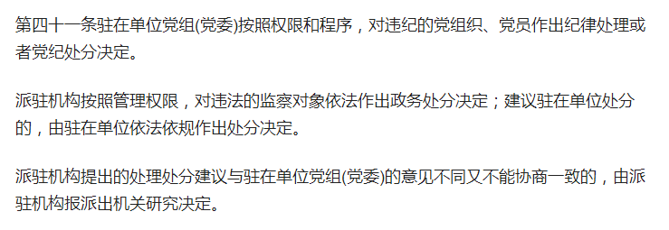 此外,根據(jù)《紀(jì)檢監(jiān)察機(jī)關(guān)派駐機(jī)構(gòu)工作規(guī)則》第41條”駐在單位黨組(黨委)按照權(quán)限和程序,對違紀(jì)的黨組織、黨員作出紀(jì)律處理或者黨紀(jì)處分決定。派駐機(jī)構(gòu)按照管理權(quán)限,對違法的監(jiān)察對象依法作出政務(wù)處分決定;建議駐在單位處分的,由駐在單位依法依規(guī)作出處分決定。派駐機(jī)構(gòu)提出的處理處分建議與駐在單位黨組(黨委)的意見不同又不能協(xié)商一致的,由派駐機(jī)構(gòu)報派出機(jī)關(guān)研究決定“規(guī)定,由于派駐監(jiān)督屬于“上對下”的監(jiān)督,派駐紀(jì)檢監(jiān)察組如提出不同意見,上述黨組織應(yīng)予充分重視并加強溝通,經(jīng)溝通仍不能形成一致意見的,一般應(yīng)報派出該派駐紀(jì)檢監(jiān)察組的紀(jì)委研究決定。