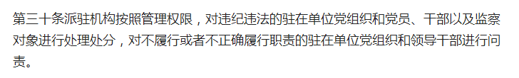 《紀(jì)檢監(jiān)察機(jī)關(guān)派駐機(jī)構(gòu)工作規(guī)則》第30條規(guī)定,派駐機(jī)構(gòu)按照管理權(quán)限,對違紀(jì)違法的駐在單位黨組織和黨員、干部以及監(jiān)察對象進(jìn)行處理處分,對不履行或者不正確履行職責(zé)的駐在單位黨組織和領(lǐng)導(dǎo)干部進(jìn)行問責(zé);