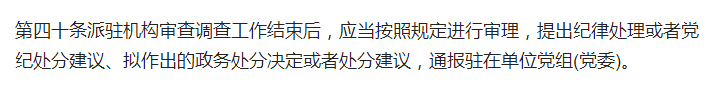 第40條規(guī)定,派駐機(jī)構(gòu)審查調(diào)查工作結(jié)束后,應(yīng)當(dāng)按照規(guī)定進(jìn)行審理,提出紀(jì)律處理或者黨紀(jì)處分建議、擬作出的政務(wù)處分決定或者處分建議,通報駐在單位黨組(黨委);