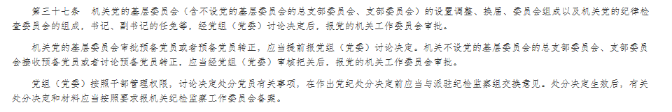 《中國共產(chǎn)黨黨和國家機(jī)關(guān)基層組織工作條例》第37條第3款規(guī)定“黨組(黨委)按照干部管理權(quán)限,討論決定處分黨員有關(guān)事項,在作出黨紀(jì)處分決定前應(yīng)當(dāng)與派駐紀(jì)檢監(jiān)察組交換意見。處分決定生效后,有關(guān)處分決定和材料應(yīng)當(dāng)按照要求報機(jī)關(guān)紀(jì)檢監(jiān)察工作委員會備案”。