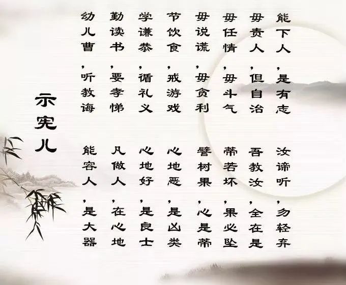 幼兒曹,聽教誨: 勤讀書,要孝悌; 學(xué)謙恭,循禮儀; 節(jié)飲食,戒游戲; 毋說謊,毋貪利; 毋任情,毋斗氣; 毋責(zé)人,但自治。 能下人,是有志; 能容人,是大器。 凡做人,在心地; 心地好,是良士; 心地惡,是兇類。 譬樹果,心是蒂; 蒂若壞,果必墜。 吾教汝,全在是。 汝諦聽,勿輕棄。 王守仁,即王陽明(1472年10月31日—1529年1月9日),幼名云,字伯安,別號(hào)陽明。因曾筑室于會(huì)稽山陽明洞,自號(hào)陽明子,學(xué)者稱之為陽明先生,亦稱王陽明。 王陽明,明代著名的思想家,是心學(xué)的集大成者,與孔子(儒學(xué)創(chuàng)始人)、孟子(儒學(xué)集大成者)、朱熹(理學(xué)集大成者)并稱為孔、孟、朱、王。 他是中國歷史上唯一一個(gè)沒有爭(zhēng)議的立德、立功、立言三不朽的圣人。曾國藩曾這樣評(píng)價(jià)他:"王陽明矯正舊風(fēng)氣,開出新風(fēng)氣,功不在禹下"。 知識(shí)拓寬格局,格局成就人生。 讀書,是獲取知識(shí),打破門第之見最廉價(jià)的捷徑。 羊羔跪乳,烏鴉反哺,孝順父母,是做人的天性良知。 從小教育孩子認(rèn)真讀書,孝敬父母,這是王陽明家訓(xùn)中的頭等大事。 有一種修養(yǎng),叫“勿以身貴而賤人”。 教會(huì)孩子不因?yàn)樽约旱某錾矶虅?shì)凌人,就是幫助孩子樹立正確的價(jià)值觀。 有的人就算成年了,還是言語任性,目中無人,人緣奇差。 有的人還沒有走上社會(huì),就已經(jīng)學(xué)會(huì)了禮貌待人,身邊總是不缺貴人。 不抬高自己,亦不貶低別人,尊重別人才能得到別人的尊重。 “飲食有節(jié)”,是古人基本的生活態(tài)度。 生活在一個(gè)更容易發(fā)胖、患富貴病的時(shí)代,連身體都控制不了,如何掌控自己的人生? 玩樂是孩子的天性,但絕不可過分沉溺游戲。 玩物,必然喪志。不立志,何談將來立德、立功、立言? 古訓(xùn)有言:“誠信為本”,誠信,就是做人的根本,是道德的基礎(chǔ)。 孔子也曾說過:“人而無信,不知其可也”。 一個(gè)連基本的誠信都不講的人,人生自然難有建樹。 貪,看似得,實(shí)則失;得了當(dāng)下,失了未來。 百年老店瑞福祥,在一次大火中燒毀了所有的賬本,掌門人決定:凡瑞福祥欠的帳一律奉還,凡欠瑞福祥的帳一筆勾銷。這便是“小商求利,大商謀道”。 《增廣賢文》中寫道:“心似平原走馬,易放難追”。 任性放縱,不知道約束和管理自己的性格,這是非常危險(xiǎn)的。 任何時(shí)候,人都不應(yīng)該做自己情緒的奴隸。 學(xué)會(huì)控制負(fù)面情緒,就已經(jīng)離成功更近一步。 毋責(zé)人,但自治 這條家訓(xùn)的意義在于:嚴(yán)于律己、寬于待人。 這很難做到,但正因?yàn)殡y,才成為中今中外,由普通走向杰出的一道天塹。 楊震拒收賄賂的故事被世人熟知:面對(duì)行賄者“不會(huì)有人知道”的論調(diào),楊震義正言辭的回復(fù):“天知地知你知我知,怎么會(huì)沒有人知道呢?” 讓孩子懂得,越自律,越自由。自律,是愛自己的最好方式。 越王勾踐臥薪嘗膽,光復(fù)大業(yè);韓信胯下之辱,十年磨劍,終遇明主。 因此王陽明說:“只要立志真切,就能克治私欲”。 一個(gè)目光遠(yuǎn)大,有志氣的人,總是能屈能伸,既能勇往直前,又懂得韜光養(yǎng)晦,能屈能伸,能下人。 王陽明認(rèn)為,多贊賞孩子,孩子的內(nèi)心富足,他們就會(huì)自信,心態(tài)平和,才能看到別人的優(yōu)點(diǎn),虛心提升自己。 古訓(xùn)有言:“海納百川,有容乃大。壁立千仞,無欲則剛。” 一個(gè)人的心胸有多寬廣,舞臺(tái)就有多大。 孔子曾經(jīng)說過:“君子周而不比,小人比而不周”。 真正優(yōu)秀的人,不僅能正視自己的才能,還悅納自己的不完美。 真正優(yōu)秀的人,要能容得下別人。別人弱勢(shì),不輕視;別人成功,不眼紅。 王陽明說:“凡做人,在心地;心地好,是良士;心地惡,是兇類。譬樹果,心是蒂;蒂若壞,果必墜”。 王陽明曾被錦衣衛(wèi)追殺,在農(nóng)場(chǎng),更是遭受了鄉(xiāng)民的偏見和攻擊。 可是他選擇了善良,教會(huì)當(dāng)?shù)剜l(xiāng)民讀書,耕種,幫助他們治病,建房子。 很快,王陽明就從一個(gè)不可信任的外鄉(xiāng)人,變成了鄉(xiāng)民口中的大善人,活菩薩。 古語云:“道德傳家,十代以上,耕讀傳家次之,詩書傳家又次之,富貴傳家,不過三代。” 讓兒孫做個(gè)好人,才是家庭延續(xù)興旺的根本。