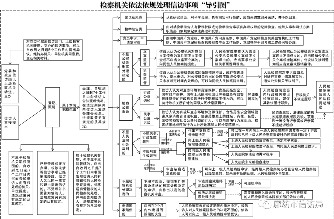 為深入貫徹落實習近平法治思想、習近平總書記關于加強和改進人民信訪工作的重要思想,落實中央全面依法治國委員會2023年重點專項工作任務,深入推進信訪工作法治化,中央全面依法治國委員會辦公室會同國家信訪局等有關部門,制定了檢察機關依法依規處理信訪事項“導引圖”及說明。