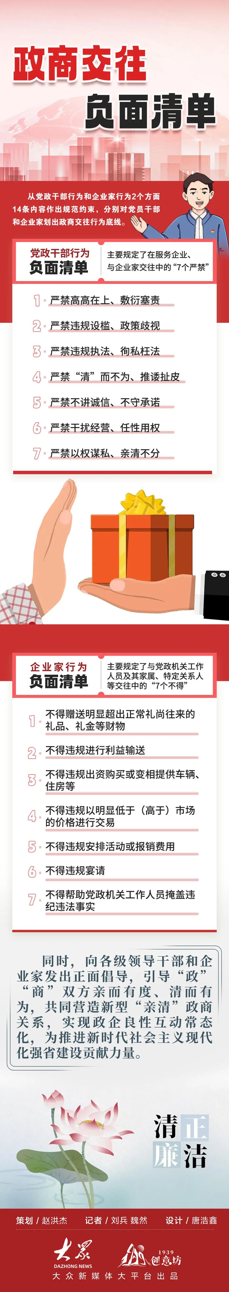 “在2019年印發的意見基礎上,這次出臺的兩份清單從黨政干部和企業家兩個方面作出規范約束,更加注重政商雙方的‘雙向奔赴、親清統一’,更加注重提升黨政干部對企業的服務意識?!笔〖o委監委黨風政風監督室負責同志介紹。在負面清單基礎上,同時發出正面倡導:各級領導干部要坦蕩真誠同企業家交往,主動作為、靠前服務,一視同仁對待各類經營主體,依法依規為企業和企業家解難題、辦實事,做到“有求必應、無事不擾”;企業家要積極主動與各級黨委、政府溝通交流,潔身自好走正道,遵紀守法辦企業,光明正大搞經營。